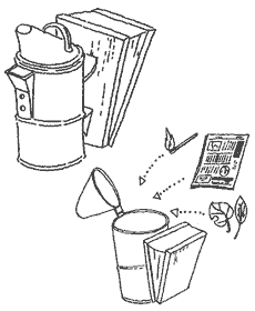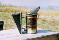 喷烟器是一种打开蜂箱盖时可以用烟熏跑蜜蜂的工具。主体使用金属制成,吹气器是用皮做的。用法是把着火的麻袋或稻草等放入主体,然后用吹气器吹入空气放出烟雾。 ![]() |