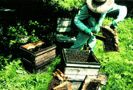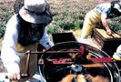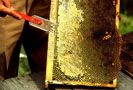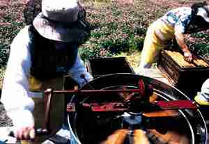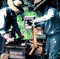 2.接下来介绍采蜜方法。 首先除去旧蜂蜜。采蜜前一个星期左右要把陈年旧蜜都采走。一个星期以后进行采蜜。工作从早上就开始。为了避免蜜蜂把当日所采集到的稀蜂蜜也混进去,采蜜基本上都安排在早上到中午的时间段内。