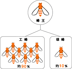 蜂王在一个蜂巢中只有一只。其余的约9成是工蜂,约1成是雄蜂。