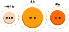 蜜蜂的食物是蜂蜜和花粉。可以说能够产生能量的糖为主成分的蜂蜜是其主食,含蛋白质、维生素、矿物质等的花粉是其副食。另外,蜂王浆是仅供蜂王和候补蜂王的幼虫吃的特殊食物。