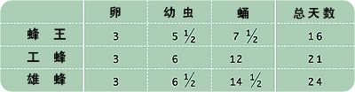 蜂王用前肢计算哺育室的大小,较大的房间产雄蜂卵,较小的房间产工蜂卵。产雌性的工蜂卵时,在即将产下卵之前蜂王送出积蓄在体内的精子使其受精。最初供给工蜂幼虫的是与蜂王浆差不多的食物,但幼虫渐渐开始长大的第3天左右,食物中开始混合花粉和花蜜。由于食物的不同,幼虫期的时间长度也不同,蜂王为5.5天,而工蜂为6天左右。蛹的时间分别是7.5天、15天左右。其后羽化长大成虫的工蜂,开始承担扫除和哺育等工作。