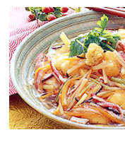 材料…供4人食用 年糕…适量 蟹肉…70克 竹笋…50克 胡萝卜(长4cm)…30克 鸭儿芹…10棵 生姜…15克 黑木耳(小)…1个