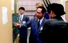 | ▲冈山大学的龟井千晃教授(中)和杉本幸雄博士(左)利用海报发表了蜂胶研究的独特成果 |