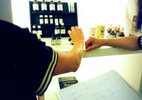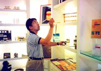“我们建议纯蜂王浆最好在早饭前先饮用,然后再喝蜂王浆饮料。瓶子分黑色和白色,就是早上喝1瓶、晚上喝1瓶的意思。早上喝的是纯蜂王浆饮料,晚上喝的是蜂胶、花粉和蜂蜜的混合饮料。一盒内装黑白各15瓶,顾客每半个月来一次,我们为他们提供各种咨询。”